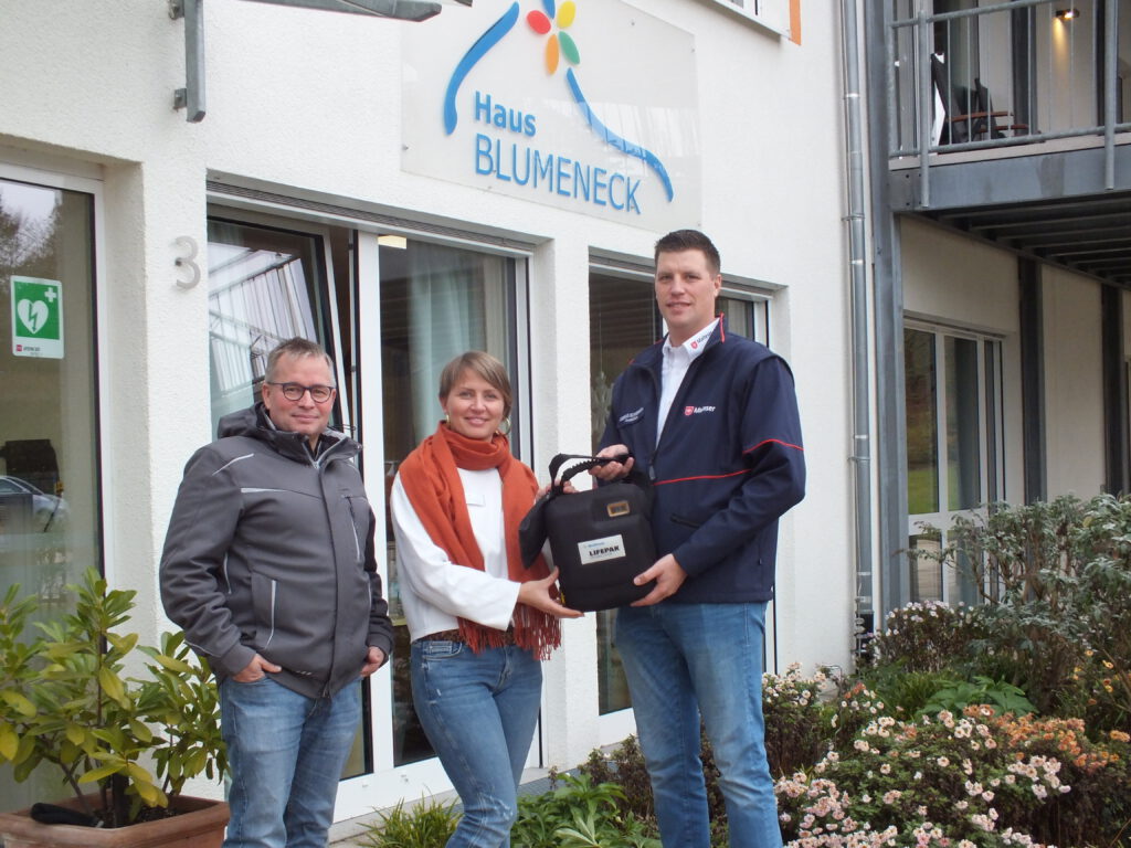 Mit diesem AED wird eine wichtige Lücke in Frauenweiler geschlossen. Der DEFI kann einen wichtigen Beitrag leisten, um bei Herz‑Kreislauf‑Stillständen die entscheidenden Sekunden bis zum Eintreffen des Rettungsdienstes zu überbrücken. Andreas Schweinfurth vom Malteser Hilfsdienst e.V. übergab den AED an Stefan Seewöster vom Stadtteilverein Frauenweiler und Frauke Agena vom Haus Blumeneck. Das Haus Blumeneck ist optimaler Standort für diesen AED, so liegt das Pflegeheim zentral im Ortsteil und ist 24 Stunden besetzt. Der AED hängt im Windfang; sollte die Türe mal geschlossen sein, bitte klingeln; die Nachschicht macht dann auf.