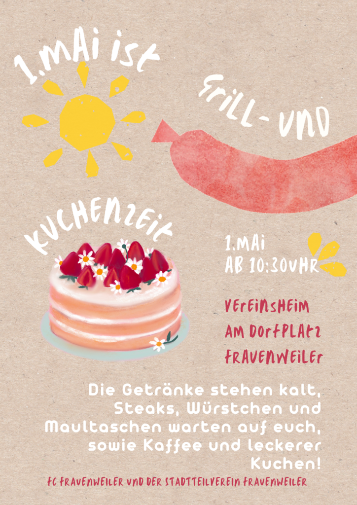 Am 1. Mai ab 10:30Uhr erwartet die Besucherinnen und Besucher am Vereinsheim am Dorfplatz in Frauenweiler ein geselliges Beisammensein für die ganze Familie. Für das leibliche Wohl ist bestens gesorgt: Neben kühlen Getränken werden Steaks, Würstchen und Maultaschen angeboten. Am Nachmittag gibt es zudem Kaffee und eine große Auswahl an hausgemachten Kuchen.